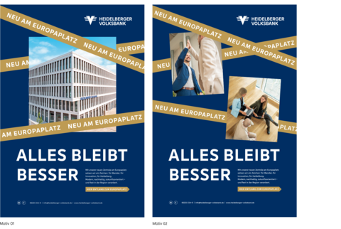Für den Umzug der Heidelberger Volksbank haben wir bereits eine Vielzahl an Materialien realisiert. Vom Citylight-Poster über Big Banner bis hin zur Fensterbeschriftung am neuen Standort. Die Gestaltungsidee ist dabei bewusst offen gedacht: modular, medienübergreifend und ausbaufähig. So bleibt die Kampagne flexibel, auch für zukünftige Inhalte und Formate.