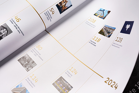 Das Herzstück: eine aufwendig gestaltete Festschrift mit 148 Seiten, veredelt mit goldener Heißfolie, goldener Sonderfarbe und einem edlen Hardcover-Schuber. Großzügige Bildwelten, kreative Infografiken, feine Typografie und eine abwechslungsreiche Gestaltung machen das Jubiläum erlebbar.