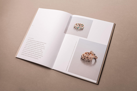 In der Gestaltung wird die Wertigkeit des Unikat Schmucks durch mehrere Heißfolienprägungen auf dem Titel und einer Sonderfarbe in Bronze-Metallic im Katalog widergespiegelt