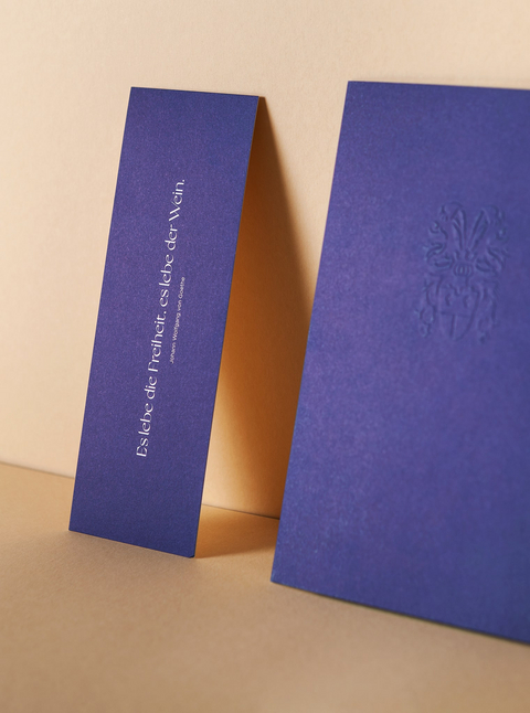 So wurde das alte Familienwappen überarbeitet und findet sich sowohl handgezeichnet auf den Etiketten der Premiumweine als auch in moderner Formensprache als Teil des Corporate Designs wider. Der neue Schriftzug verbindet zeitlose Typografie mit markanten Details, während leuchtendes Blau plakativ wirkt, ohne an Hochwertigkeit einzubüßen. Die einzelnen Komponenten wie Monogramm, zwei sich ergänzende Corporate Fonts und harmonische Sekundärfarben passen sich flexibel den Einsatzmöglichkeiten an, welche wie die wechselnden Jahrgänge dem stetigen Wandel unterlegen sind.